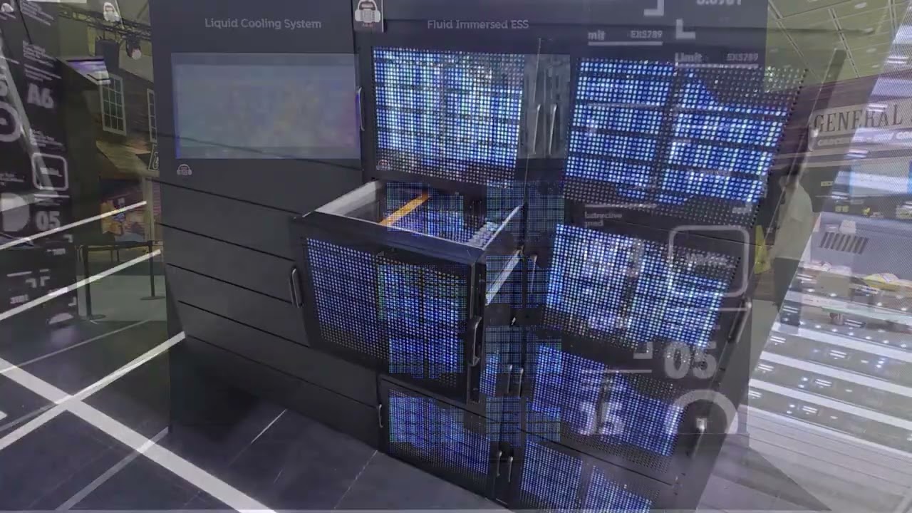 AI데이터 센터를 형상화한 AIDC코너의 대형 LED 미디어월과 액침냉각 기술 소개 전시콘텐츠,